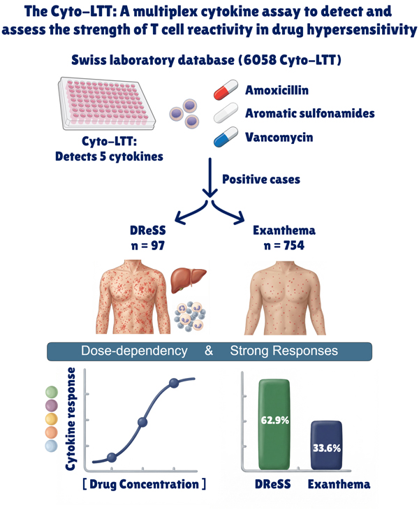 Editor’s comment: The conventional in vitro lymphocyte transformation assay (LTT) for diagnosing drug hypersensitivity reactions is limited by sensitivity. Peyer et al. (Switzerland) report a cytokine-based lymphocyte transformation test (Cyto-LTT) that quantifies drug-specific cytokine responses in T cells. The results reveal dose-dependent T cell activation in delayed drug hypersensitivity, challenging that drug allergic reaction are dose-independent. Their findings suggest that delayed drug hypersensitivity reflects graded immune activation with clinical relevance. Please also refer to Review Article by Werner J. Pichler entitled "Undressing DReSS as p-i mediated disease"