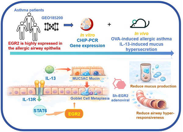 Editor’s comment: Goblet cell metaplasia is a key pathological feature of allergic asthma, but its regulatory mechanisms remain incompletely defined. Xu et al. (China) demonstrates that transcription factor EGR2 is selectively upregulated in allergic airway epithelium and functions downstream of IL-13/STAT6 signaling. Genetic and pharmacological modulation of EGR2 alters mucus production and airway hyperresponsiveness, identifying EGR2 as a critical transcriptional regulator of asthmatic epithelial remodeling.